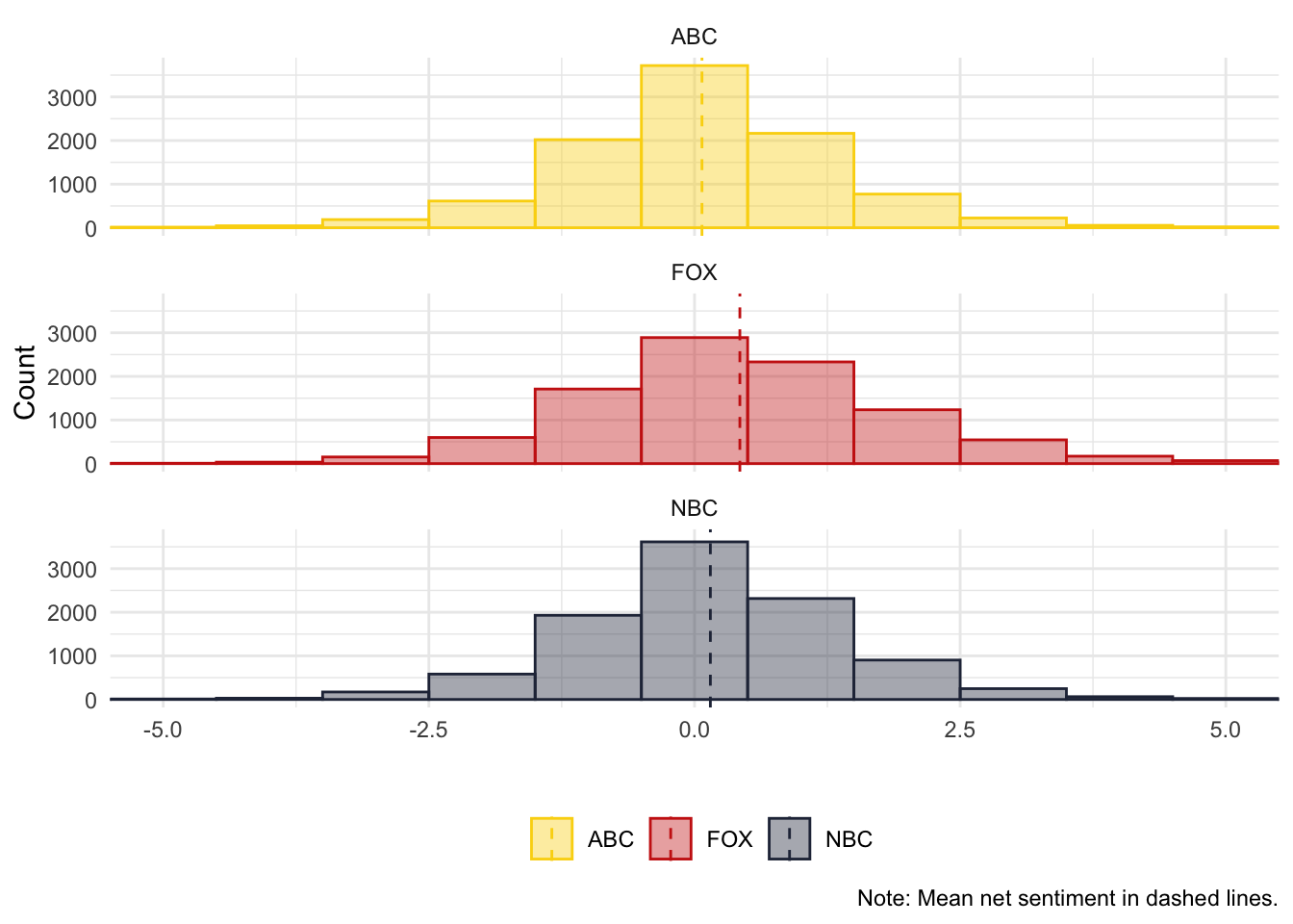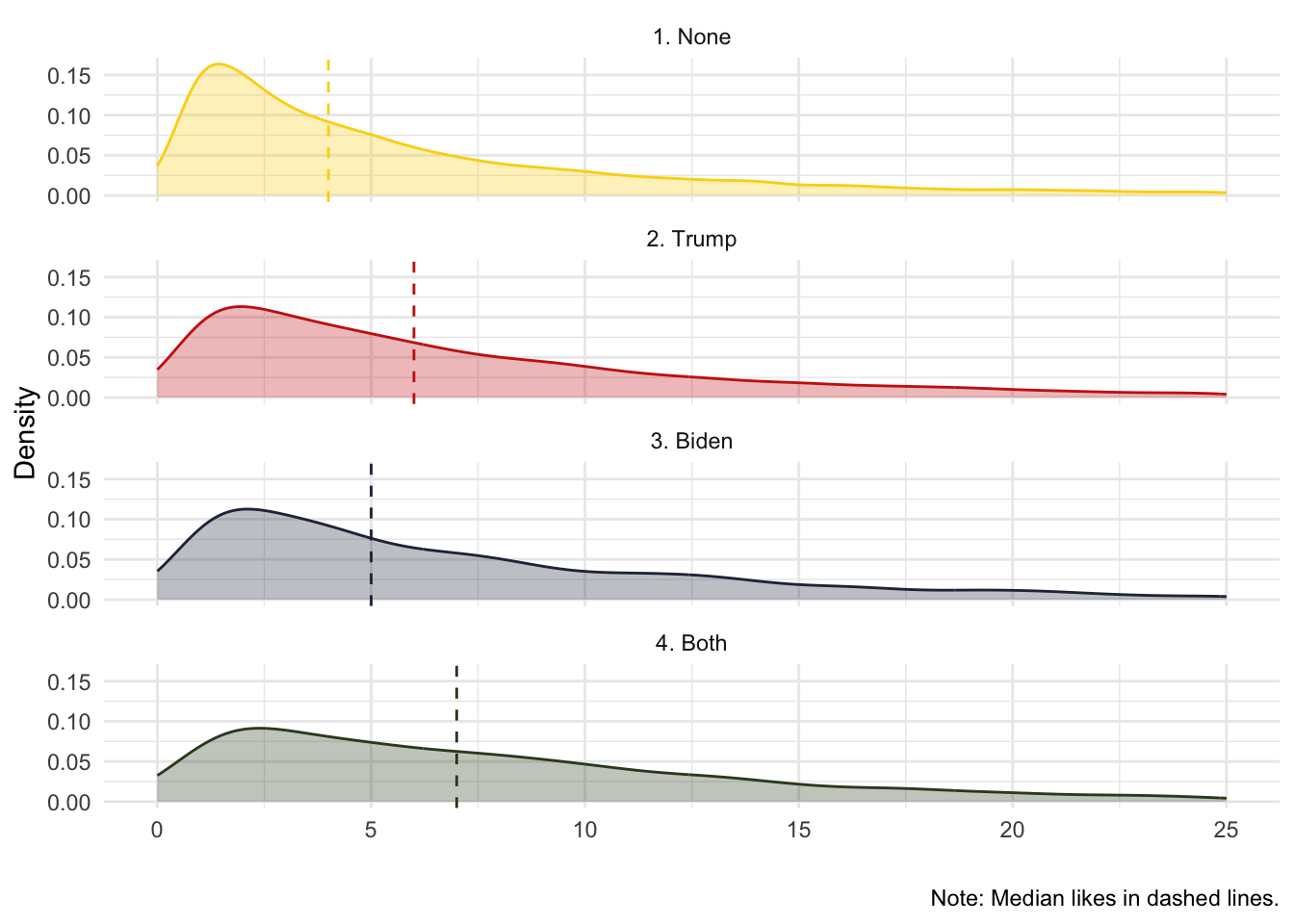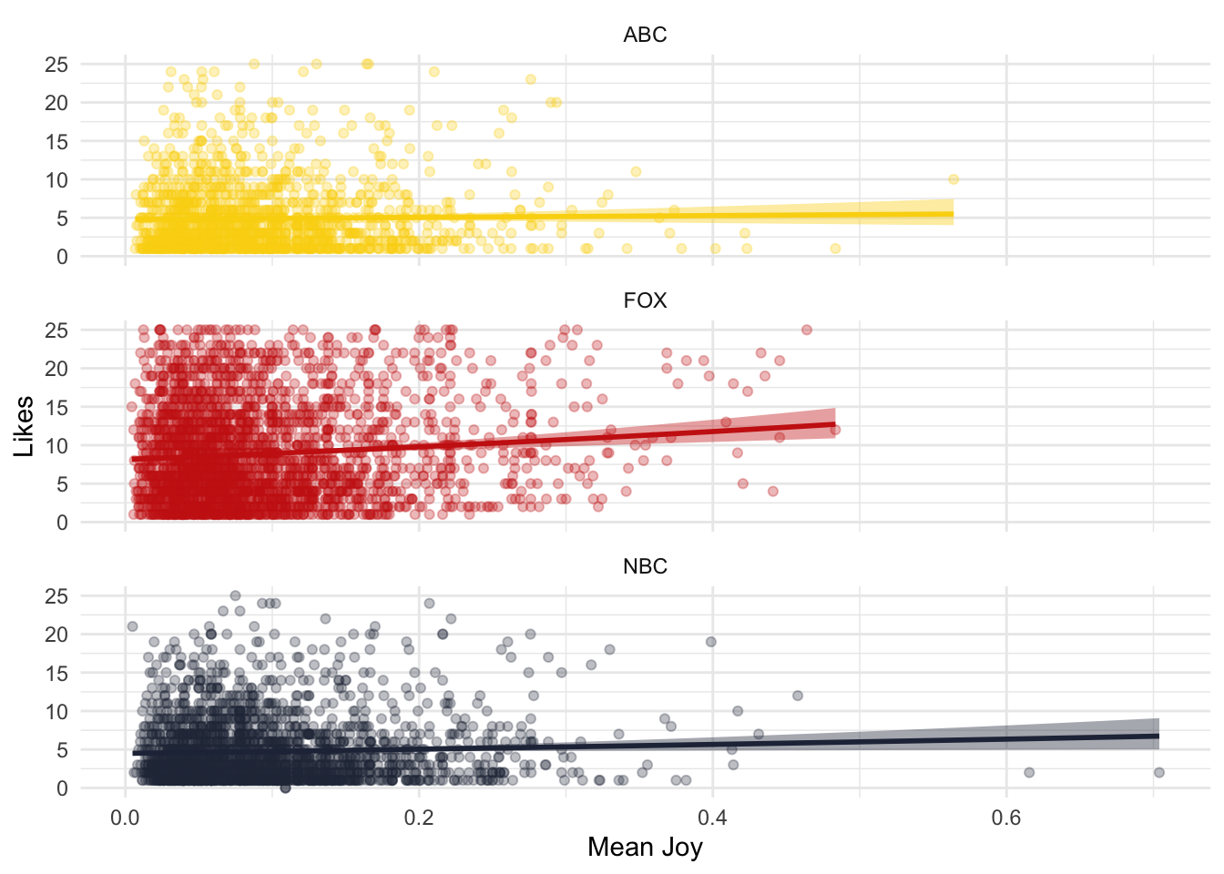 labs(x="Mean Joy", y = "Likes", color = "", fill = "")## mutate: new variable 'media' (character) with 3 unique values and 0% NA