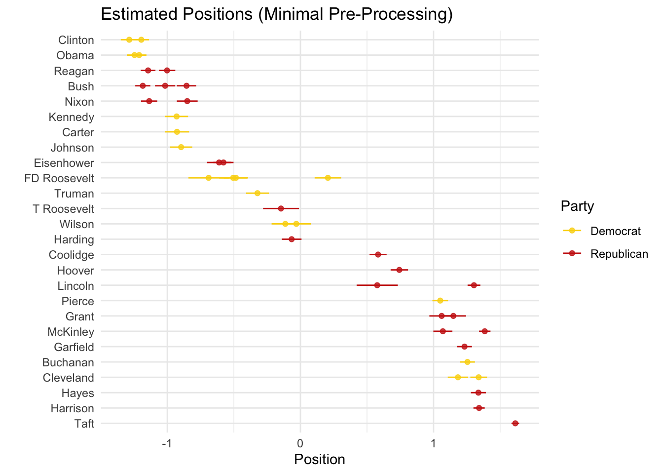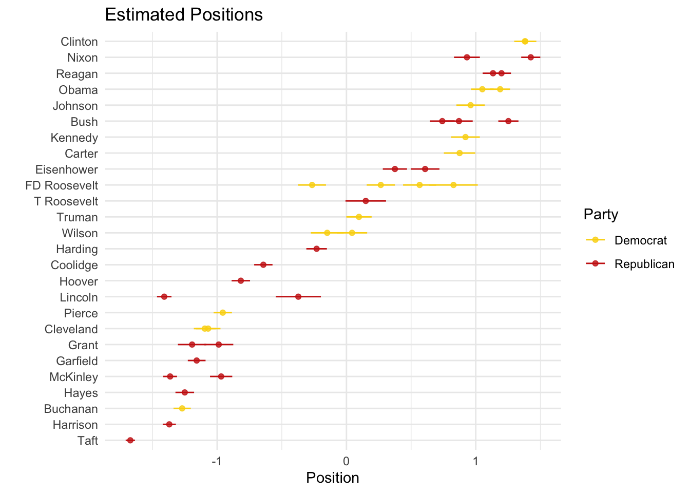Let’s see whether this makes any sense. Since we know each president’s party, we would expect Republican presidents to cluster together and separate from Democrats (or something along those lines):