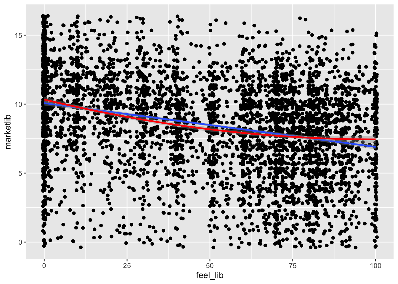 Using our sample CES dataset, explore the relationship between Canadians’ support for free market principles (\(marketlib\)) and age (\(age\))? Is there is a relationship? If so, is it linear?