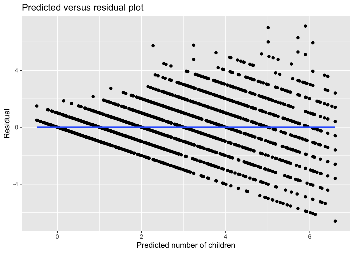 Adding the quadratic (i.e. squared) term for age to the model returns a positive coefficient for \(age\) and a negative coefficient for \(age^2\). This means that there is a positive relationship between age and the predicted number of children up until a point, and then the relationship becomes negative.