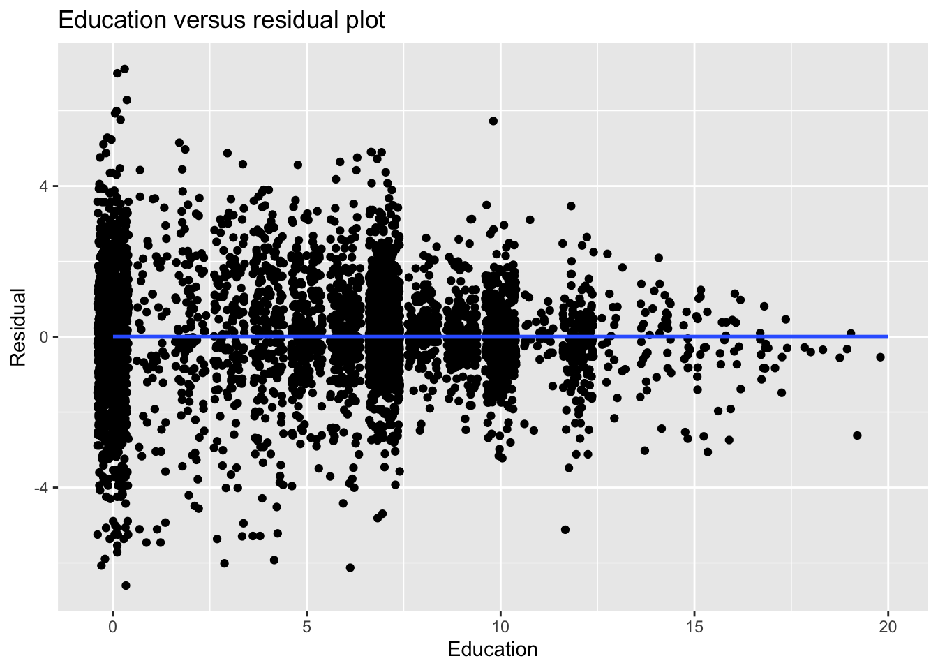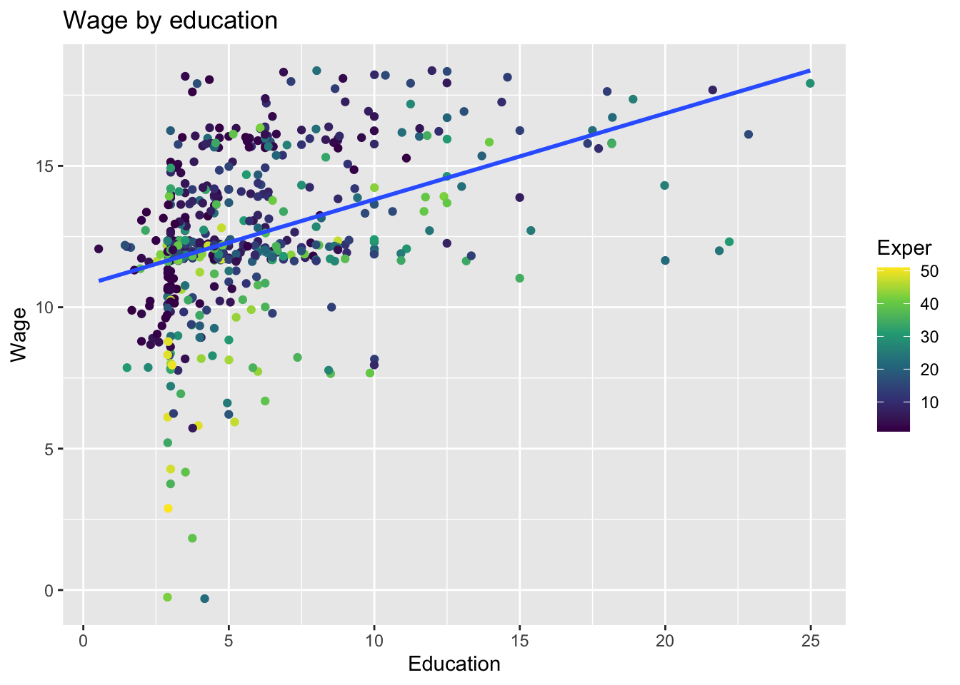 Looking at the scatterplot \(wage\) versus \(educ\), colour-coded by \(exper\) gives some hints as to why we see this pattern. In the lower left-hand corner (i.e. low education and low wage), we see the greatest concentration of high to very high experience (green to yellow) versus other parts of the map. These could be older folks with lower levels of (formal) education and work in lower-paying “lower-skill” jobs.