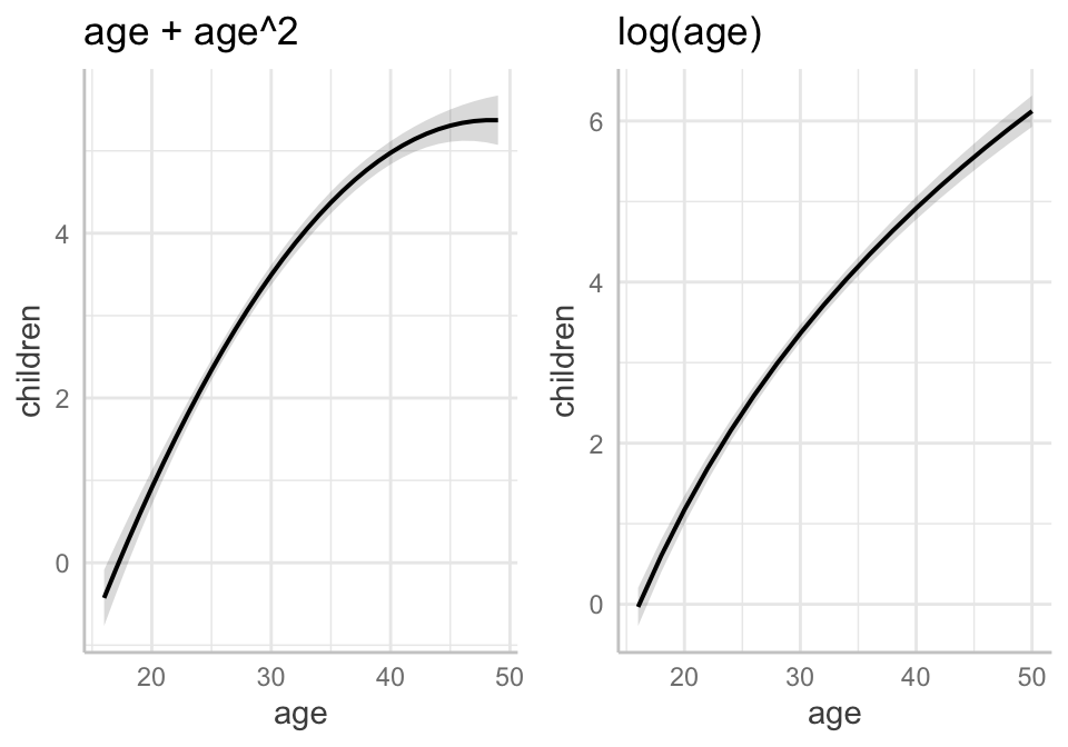 Because we automatically get the F-statistic and its associated p-value with our model outputs, we see that we get a positive test result for both our quadratic and logarithmic form models.