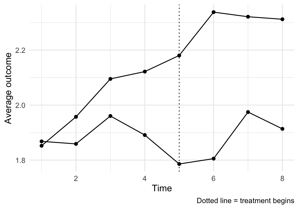 labs(x = "Time", y = "Average outcome", caption = "Dotted line = treatment begins") +